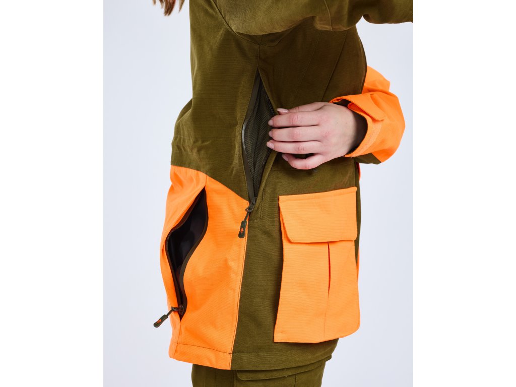 Dámská lovecká bunda odolná proti větru a vodě s vysoce prodyšnou síťovanou podšívkou a bočními větracími zipy pro lepší proudění vzduchu. Vybavená praktickými kapsami, včetně fleecem podšitých kapes na ruce, objemných předních kapes, dvojitých kapes na vysílačku a kapsy na GPS. Ideální pro lovkyně a aktivní psovody.
