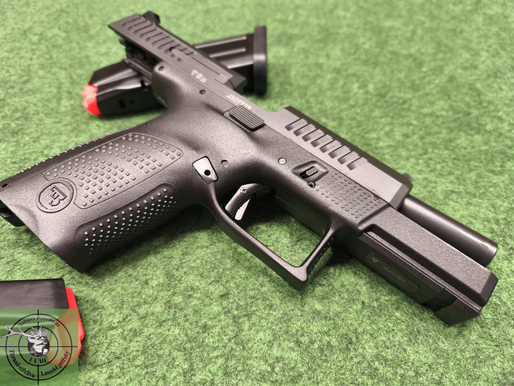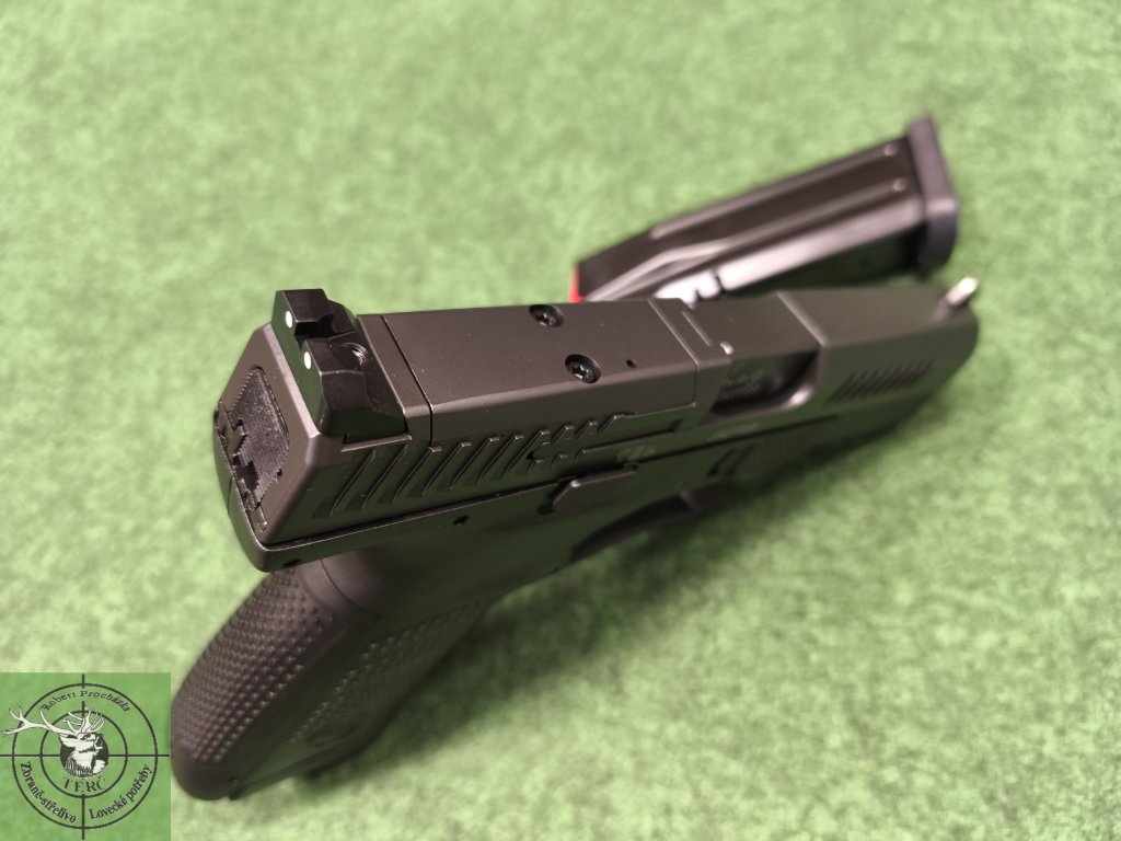 Model se závěrem upraveným pro snadnou montáž kolimátoru. Pro originální řešení CZ je typická robustnost, pevnost a odolnost montáže, nízká stavební výška, snadné nastřelení kolimátoru i na větší vzdálenosti a možnost použití zvýšených mechanických mířidel při selhání optiky. Bezpečnostní prvky zbraně: pojistka spouště, pojistka táhla spouště, blokace úderníku.