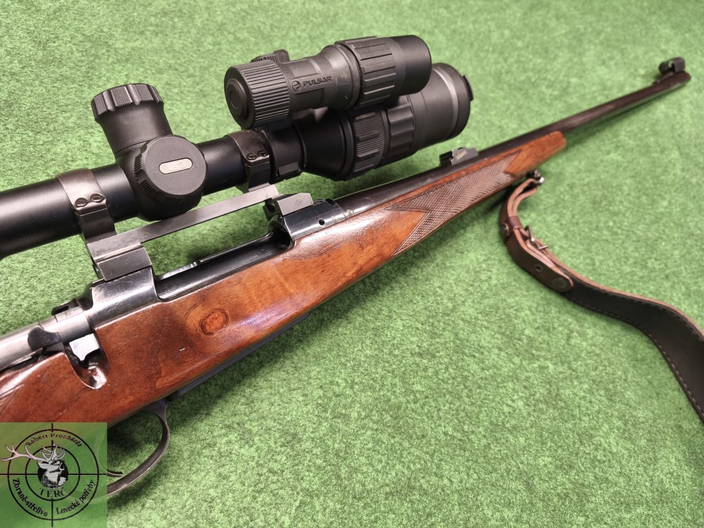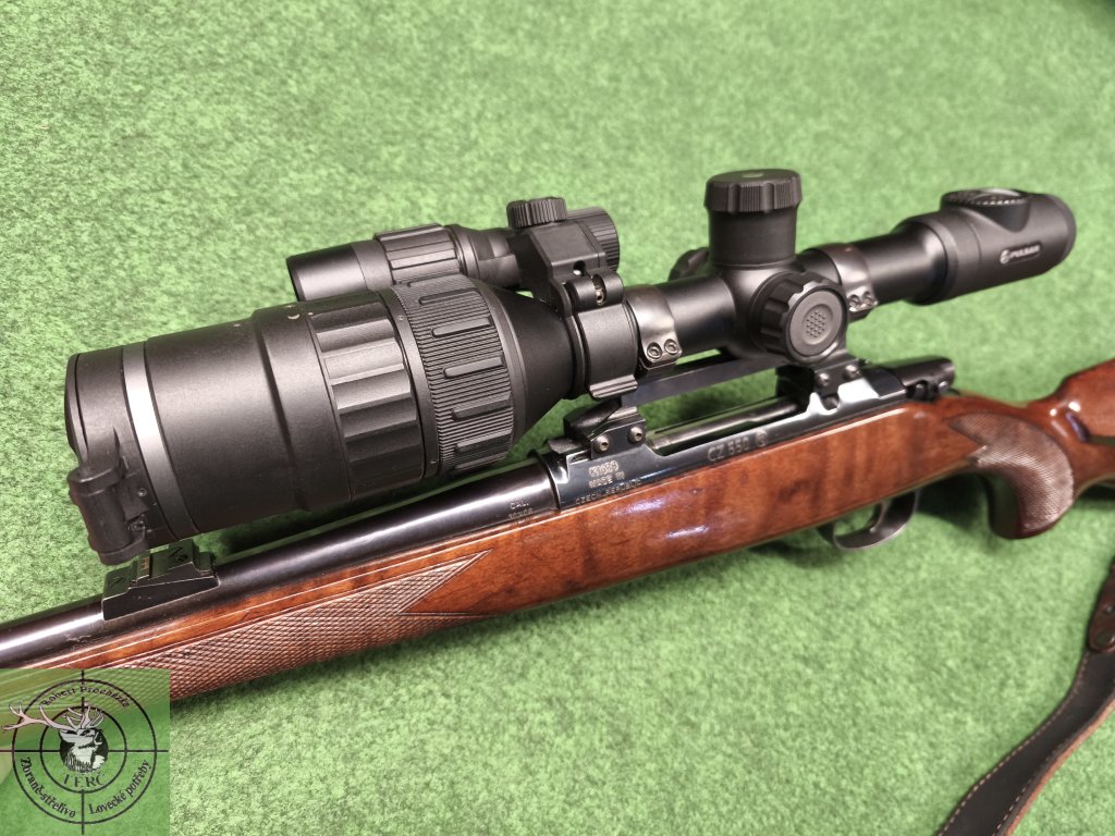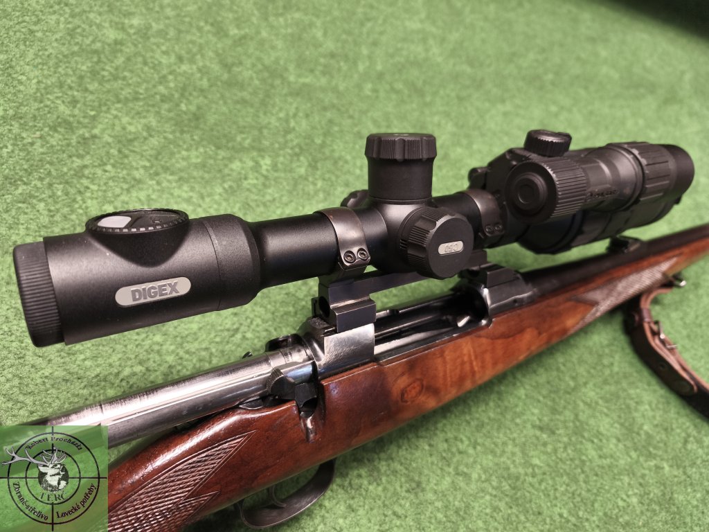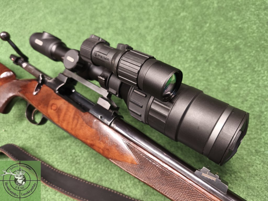 Na zbrani osazený v pevné montáži Pulsar Digex C50 s IR přísvitem. Pulsar v pěkném stavu, bez známek hrubého zacházení, pěkné čisté nepoškrábané čočky, velmi pěkný čistý a ostrý obraz. Celkem 3x externí baterie, kompletní nabíječka, záruční list ze dne 23.9.2022.