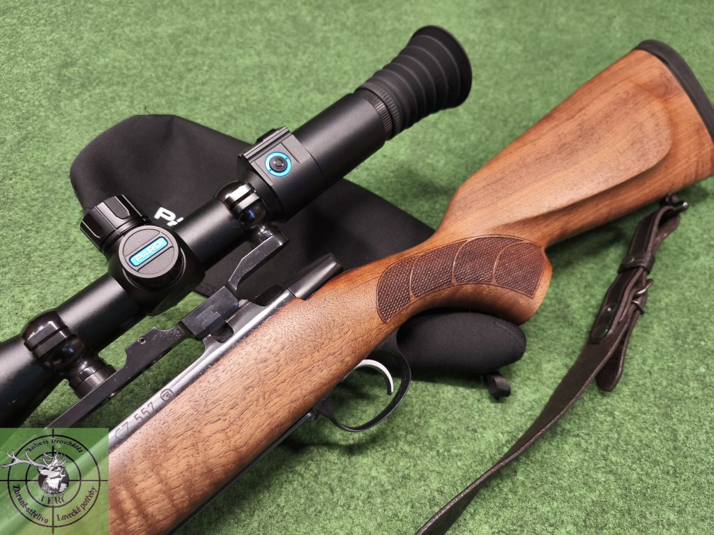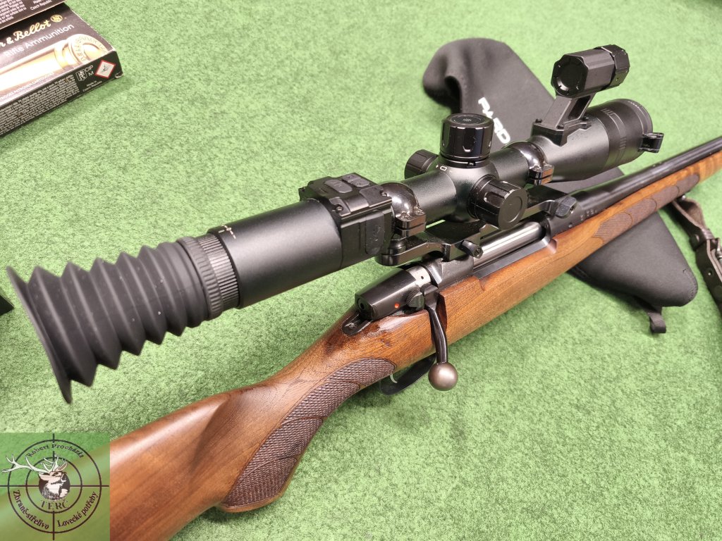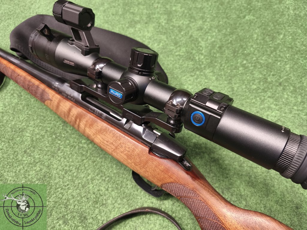 Na zbrani osazen digitální noční zaměřovač Pard DS35 s IR přísvitem, přístroj ve velmi pěkném stavu, téměř bez známek používání, pěkné čisté nepoškrábané čočky, pěkný čistý a ostrý obraz, display bez nefunkčních pixelů. Pard osazený v jednodílné ocelové násuvné montáži.