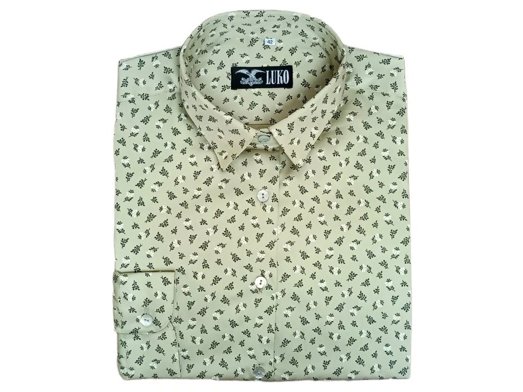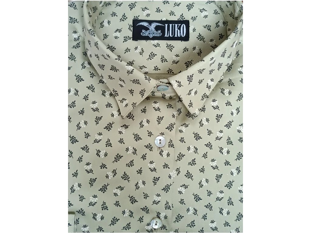 Dámská halenka s dlouhým rukávem ze 100% bavlny v saténovém provedení zelené barvy se vzory kvítků a ozdobena perleťovými knoflíky.