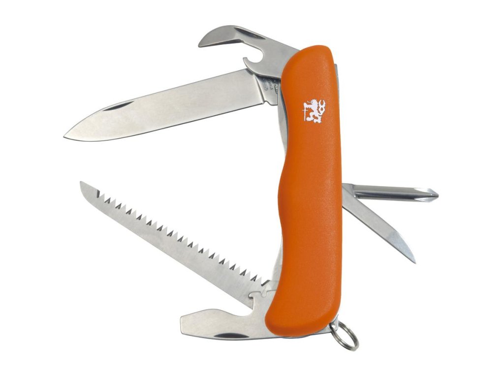 čepel, otvírač na láhve/šroubovák/drážka na odizolování vodičů, otvírač na konzervy, pilka, křížový šroubovák, bodec, kroužek