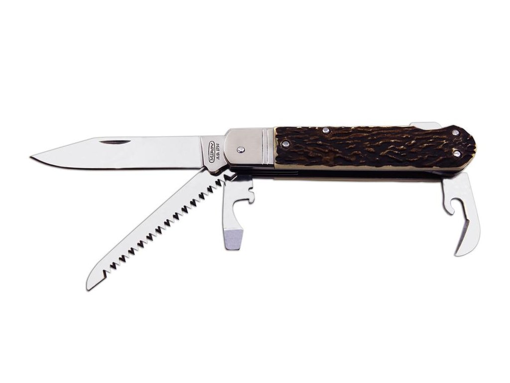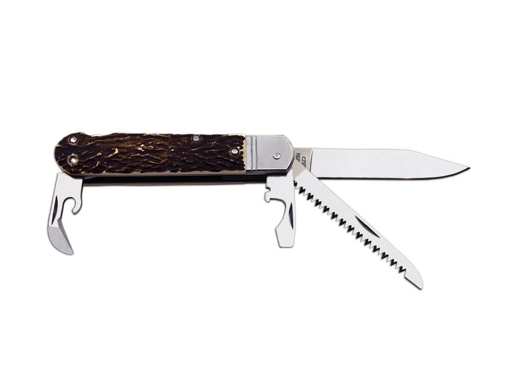 Lovecký nůž FIXIR je vybaven čepelí z velmi kvalitní nerezové oceli 440A o tvrdosti 54-57 HRc. Čepel loveckého nože FIXIR má kónický výbrus, což umožňuje nejen lepší řezivost, ale i údržbu. Tento typ loveckého nože FIXIR je také vybaven kvalitní pilkou s dvěma řadami zubů. Dále je tento lovecký nůž FIXIR vybaven otvírákem na konzevy a otvírákem na láhve, který lze použít i jako plochý šroubovák či k odstraňování izolace. Lovecký nůž FIXIR je dodáván včetně papírové dárkové krabičky, kožené pouzdro není součástí balení. Střenky loveckého zavíracího nože FIXIR jsou vyrobeny z velmi kvalitní imitace parohu. Lovecký nůž FIXIR je dodáván včetně papírové krabičky.