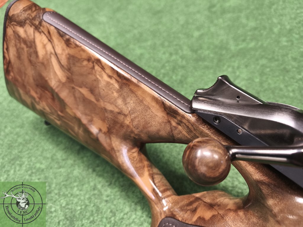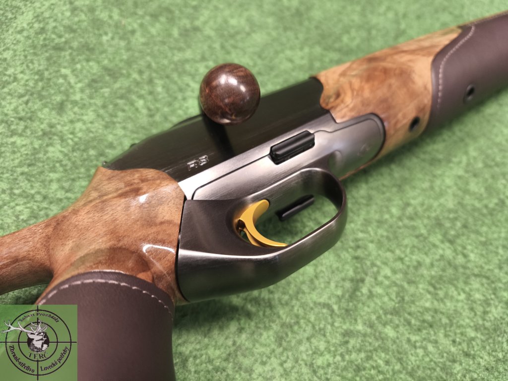 Blaser R8 Success Ruthenium Leather se systémem změny odporu spouště "ATZL" a pozlacenou kleštinou. R8 Success Leather vůbec poprvé kombinuje vzácné ořechové dřevo a prémiovou kůži. Dvoudílnou pažbu s průvlakem pro palec elegantně zvýrazňuje baskule se závěrem "Rethenium", vyrobená z ušlechtilé oceli, podtržením celé elegance jsou doplňky v podobě zlatého spoušťového jazýčku a zlaté kleštiny závěru. Ergonomicky dokonalý tvar pažby pro palec poskytuje zcela uvolněné držení zápěstí a paže v jakékoli palebné pozici, což zajišťuje zkomfortnění a zpřesnění střelby. Kožené úchopové plochy nabízejí velmi pohodlný pocit a optimální grip v každé situaci. Varianta nejpřírodnějšího vykreslení dřevěné pažby doplněné o elegantní úchopové plochy z nejkvalitnější kůže, tak aby nedošlo k narušení kontinuity kresby pažby. Provedení pro pravorukého střelce. Uvedené ceny jsou za kompletní složenou zbraň (pažba, hlaveň, kleština, závěr). V naší nabídce držíme stálou skladovou zásobu nejpreferovanějších ráží - hlavně jsou vždy bez miřidel a se závitem pro příslušenství.