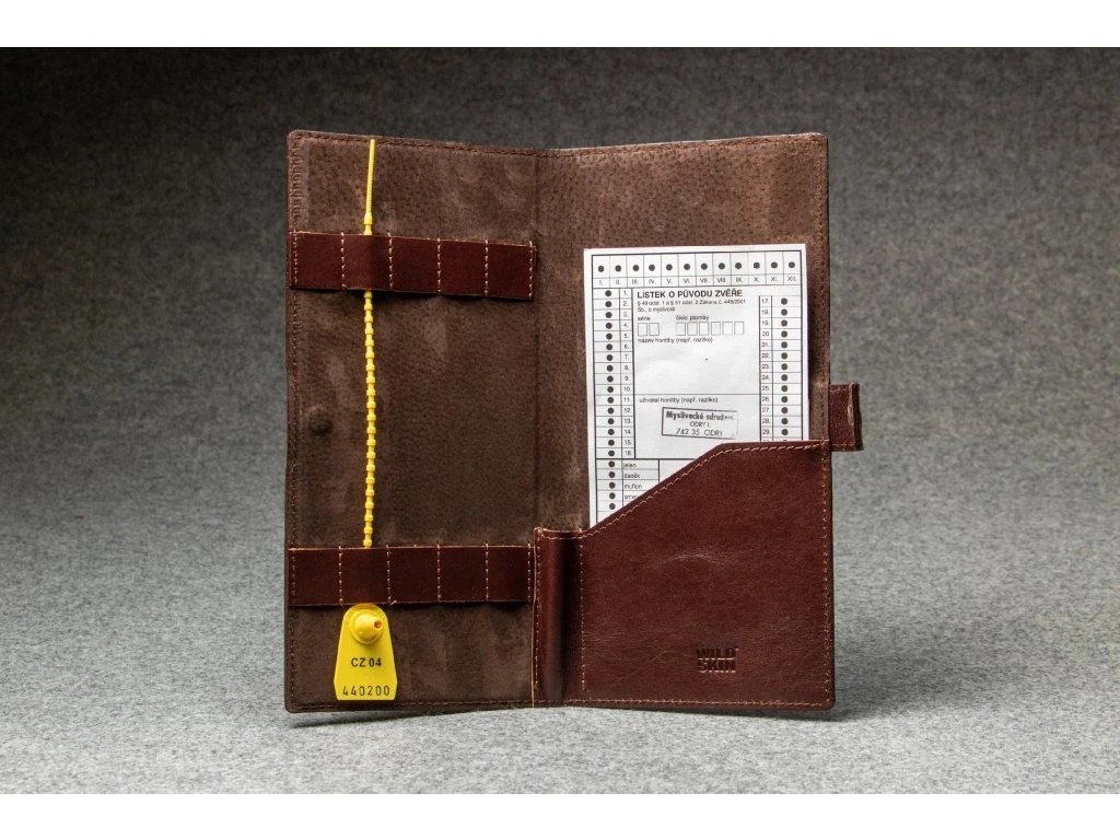 Obal je vyztužený, aby současně dobře sloužil jako podložka pro psaní. Na vnější straně jsou připravené dvě slídové kapsy na veškeré doklady, které v lese potřebujete - zbrojní průkaz, průkaz zbraně, povolenka k lovu, OP a další. V obalu jsou našitá poutka pro 5-10 ks plastových plomb a na protější straně se nachází záložka na Průvodní lístky o ulovené zvěři. Uprostřed je poutko na propisku.