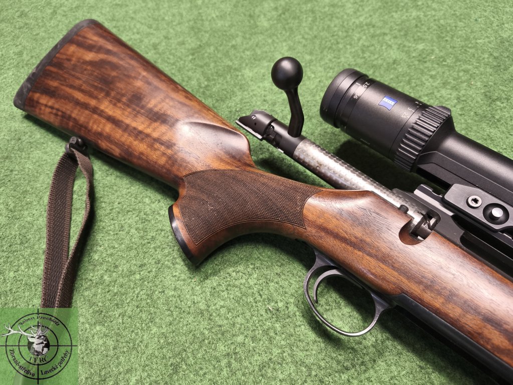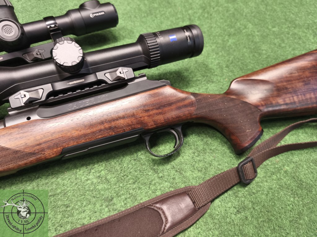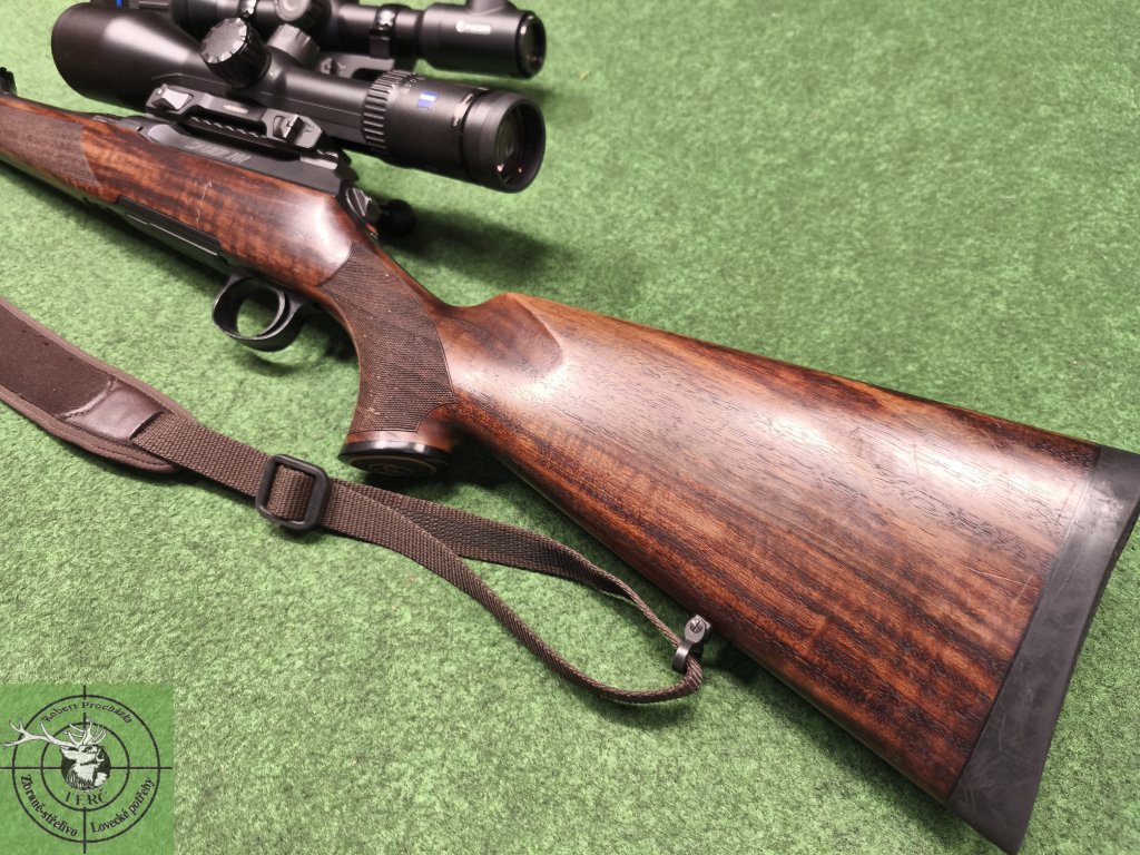 Sauer v dobrém stavu, mechanicky plně funkční. Vývrt velmi pěkný-udržovaný, bez známek vysokého opotřebení. Pažba v dobrém stavu., bez prasklin, nese pouze standardní kosmetické neduhy od běžného používání. Na Sauer osazena kvalitní ocelové weaver deska.